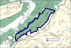 The area is within the Ridge and Valley Subsection of the Northern Ridge and Valley Section in the Central Appalachian Broadleaf Coniferous Forest-Meadow Province.[2] Yellow poplar, northern red oak, white oak, basswood, cucumber tree, white ash, eastern hemlock and red maple are found in colluvial drainages, toeslopes and along flood plains of small to medium-sized streams. White oak, northern red oak, and hickory dominate on the north and west, while chestnut oak, scarlet oak and yellow pine are found on ridgetops and exposed sites.[2] There are about 39 acres of the Dragons Tooth Trail/McAffee Knob Special Biological Area on the southwest boundary.[1][2]
