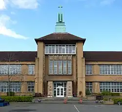 In 1894 Archbishop Eyre of Glasgow invited Mary Lescher and the Sisters of Notre Dame to come from the Mother House in Liverpool to establish a community in Glasgow.[2] The Notre Dame Training College was opened in 1893 at Dowanhill and began teaching in January 1895. In 1897 Notre Dame School was opened as a private secondary and Montessori school,[2] with a roll of 24 pupils, instructed by two teachers. By 1912, the number of pupils had risen to 193. Overcrowding led to proposals for a new building. This was designed by Thomas Cordiner in 1939, but due to the outbreak of war, construction was delayed, and the building opened in 1953. In 1987, the school was protected as a category A listed building.[3] At the same time as proposals to close the school were defeated.[4] The former high school building and adjoining primary school building and church were damaged in a fire on 12 June 2010.[5]