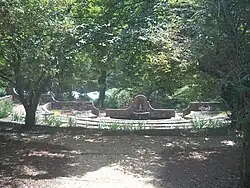 Sundial Garden that has the actual sundial in the center of it. It was believed to be used for tea and floribunda type roses. The Sundial Garden is similar changes to the gardens as summer sunflowers, fall mums, and winter cabbage and kale. The last garden is the Sunken Garden in end of the line of gardens. The Sunken Garden was constructed in 1934 and completed in 1936 as an amphitheatre area for small concerts and entertaining but now it is a garden. Kwansan cherry trees (which were given by the Emperor of Japan in the 1930s) and collection of day lilies (given by the Georgia Day Lily Society in the 1980s) are in the garden with the changes of the seasons, annuals, and ornamental grasses (summer), mums (fall), and pansies, violas, cabbage, and kale (winter) in the beds.[10]