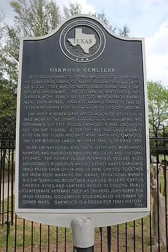 The Texas Historical Commission recognized Jefferson's Oakwood Cemetery as a Texas Historical Cemetery on November 10, 2004, designating it as cemetery MR-C011.[4]