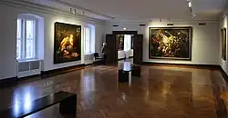 The exhibition rooms house, among other things, one of the most important collections of portraits of members of the House of Nassau and House of Orange. The Rubens Hall houses nine works by Peter Paul Rubens, including the loaned The Rape of the Daughters of Leucippus, an oil sketch for his Ecce Homo and the first of his treatments of The Descent from the Cross. One of the most important rooms in the museum is the 14th century Gothic Hall with its original greywacke herringbone pavement. Other rooms are dedicated to famous people from Siegerland, such as the writer and doctor Johann Heinrich Jung-Stilling and the musical Busch brothers.[6]
