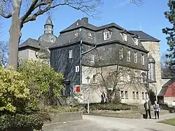 In 1888 the city of Siegen bought the Obere Schloss from the Kingdom of Prussia for 30,400 marks[3] and established the Siegerlandmuseum of regional history there in 1905.[4] It was inaugurated on 25 March 1905.[5] Its mission was stated to be to "present the essence of the Siegerland homeland in terms of history, culture and folklore". It had only three exhibition rooms in the Schloss, but this had been expanded to 35 rooms by 1929 and it now has 1.500 m² of display space.[6] On 8 July[a] 1938, a 150-metre-long 14-metre-deep show mine opened under the castle courtyard to demonstrate the original facilities and equipment of a Siegerland mine.[7][6][8]