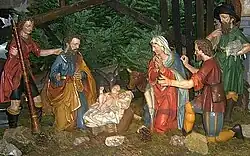 Christmas traditions for many nations include the installing and lighting of Christmas trees, the hanging of Advent wreaths, Christmas stockings, candy canes, setting out cookies and milk, the creation of Nativity scenes depicting the birth of Jesus Christ and giving gifts to others.[1] Christmas carols may be sung and stories told about such figures as the Baby Jesus, Saint Nicholas, Santa Claus, Father Christmas, Christkind or Grandfather Frost. The sending and exchange of Christmas card greetings, observance of fasting and special religious observances such as a midnight Mass or Vespers on Christmas Eve, the burning of a Yule log, and the giving and receiving of presents are also common practice. Along with Easter, Christmas is one of the most important periods on the Christian calendar, and is often closely connected to other holidays at this time of year, such as Advent, the Feast of the Immaculate Conception, Saint Nicholas Day, Saint Stephen's Day, New Year's, and the Feast of the Epiphany.[2]
