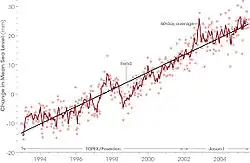 It is predicted that by 2100, sea levels will have risen by 1–3 metres as a result of global warming, and by 2050 sea level rise is estimated to impact 90% of the world's coastal cities.[22] Theorists who support ocean colonization hope to face the issue and provide a solution for groups and nations worldwide that are most at risk.[22]