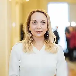 Olena Viktorivna Khomenko (Ukrainian: Олена Вікторівна Хоменко; born in 7 December 1975), is a Kyrgyz-born Ukrainian politician who is currently serving as a member of parliament, People's deputy of Ukraine of the 9th convocation of the Verkhovna Rada since 29 August 2019.[2]