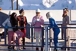 While the first unit shot at Piz Gloria, the second unit, led by John Glen, started filming the ski chases.[36] The downhill skiing involved professional skiers, and various camera tricks. Some cameras were handheld, with the operators holding them as they were going downhill with the stuntmen, and others were aerial, with cameramen Johnny Jordan – who had previously worked in the helicopter battle of You Only Live Twice — developing a system where he was dangled by an 18 feet (5.5 m) long parachute harness rig below a helicopter, allowing scenes to be shot on the move from any angle.[17] The bobsledding chase was also filmed with the help of Swiss Olympic athletes,[25][37] and was rewritten to incorporate the accidents the stuntmen suffered during shooting, such as the scene where Bond falls from the sled. Blofeld getting snared with a tree was performed at the studio by Savalas himself, after the attempt to do this by the stuntman on location came out wrong.[17] Heinz Lau and Robert Zimmermann served as the stunt doubles for Bond and Blofeld during the bobsleigh scene.[38] Glen was also the editor of the film, employing a style similar to the one used by Hunt in the previous Bond films, with fast motion in the action scenes and exaggerated sound effects.[25]