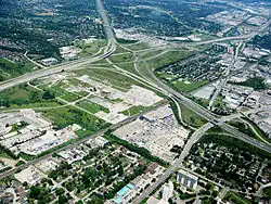 Planning for the segment of Highway 403 through Mississauga dates to the late 1950s when the Hamilton Expressway appeared on the Metropolitan Toronto's regional transportation plan. It was to be a continuation of the Richview Expressway, which was ultimately never built, continuing from Toronto to Hamilton.[18] The plan featured the expressway's eastern terminus at the Highway 401 and Highway 427 interchange. As Toronto's anti-expressway movement gained momentum, provincial plans shifted the Hamilton Expressway to the west near Etobicoke Creek. In 1962, the right-of-way alongside the hydro corridor between Burlington and Etobicoke Creek was protected after traffic studies indicated the need for a future freeway.[19] On May 25, 1965, the Department of Highways unveiled the Toronto Region Western Section Highway Planning Study. The plan designated Highway 403 north from Burlington and then parallel with the QEW to Highway 401 near Highway 27.[40]