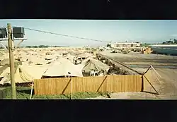 Camp conditions were challenging due to high heat conditions, water shortages, lack of restroom facilities, and large amounts of trash. The camps were secured using fences constructed of concertina wire covered in netting and were surrounded by portable light generators. Refugees lived in tents, and slept on military issue cots. Portable restrooms were located throughout the camp, and Navy Seabees constructed concrete shower facilities within the camps. Camp security included interior camp patrols, exterior camp patrols, and fixed exterior towers.