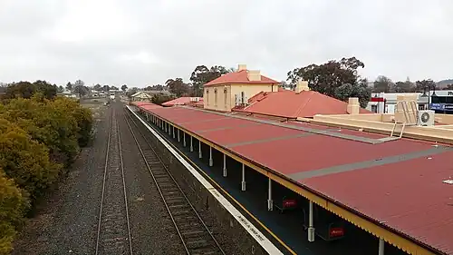 Major structures at the complex include a type 1, sub-type 3, brick station buildings with combined office and station, completed in 1877, with additions completed in 1902, 1907, and 1915; and associated platform; both managed by RailCorp.[1] Other structures, managed by the Australian Rail Track Corporation (ARTC) include a type ll Station Master's Residence located at 158 Peisley Street, completed in 1885; a timber Railway Institute Building located at 156 Peisley Street, completed c. 1921; an administration building located at 154 Peisley Street, completed c. 1950, a through goods shed located in Piesley Street, completed in 1877; a rail motor shed located in Piesley Street, completed c. 1950; a signal box, completed in 1938, identified for removal as part of a statewide strategy to manage redundant signal boxes; a transhipment shed located in Endsleigh Street, completed c. 1959; and a Perway Inspector's Office and Depot, also located in Endsleigh Street. Other items include an iron footbridge with concrete deck, completed in c. 1910 and extended in 1938; and a 4.5-tonne (5-short-ton) jib crane.[1]