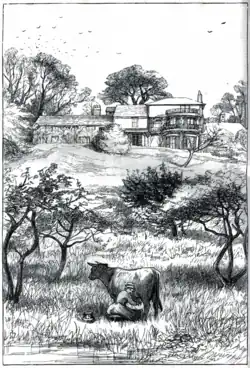 Orley Farm was written between July 1860 and June 1861.[4] The novel was first published in monthly shilling parts by the London publisher Chapman and Hall from March 1861 to October 1862, with forty wood-engraving illustrations by John Everett Millais. Each part comprised two illustrations that were situated at the front, and two to three chapters that followed. The first volume, also published by Chapman and Hall, appeared in December 1861, before the novel's serialisation was completed.[4] The second volume was published in September 1862, and both volumes included the illustrations.