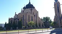 Designed by Jan Kabac, erected since the 1980s and consecrated in 1999, the church is the largest Orthodox church in Poland.[8][9] It is a single-nave, five-domed building with two altars. The entire architectural concept of the church is based on the symbolism of the Descent of the Holy Spirit. The walls and domes were shaped like tongues of fire. The church has five domes that refer to the figure of Jesus Christ and the four evangelists. The church nave was laid out on an octagon plan with an area of over 800 square meters. From the east, there is an altar room divided into a part with a main altar and a side altar (its patron is Saint Sava).[10]