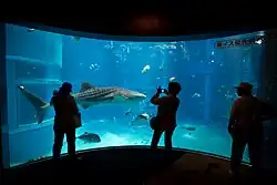 The most popular animals on display are the whale sharks. Osaka aquarium is the second aquarium in the world after Okinawa Ocean Expo Aquarium to start keeping whale sharks. In 1994, the aquarium successfully housed a manta ray in captivity, which was the second in the world at the time. The following year, the aquarium managed to successfully house an ocean sunfish[2] in captivity, becoming one of the few aquariums in the world to house this fish. Due to its comically large size and shape, it is reported to be a more popular exhibit at the aquarium than the whale sharks.[14]