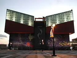 The three color schemes that characterise the exterior of the building mimic the union of earth, water, and fire. The fish mural on the exterior wall was painted by Serge Chermayeff, an English designer living in the United States, and the entire building was designed by his son, Peter, who headed the Cambridge Seven Associates Environmental Development Institute.[29]