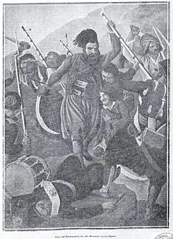 The Egyptian artillery failed to breach the walls, so Ibrahim decided to launch two ships with cannons and have them bombard the Maniot defences from the sea.[14] He also combined this attack with infantry assaults, however these failed as the invaders were driven back from the walls eight times.[14] The attacks lasted for a few more days before the Egyptians and Ottomans were forced to retreat when news arrived that Kolokotronis was approaching their rear with 2,000 men.[15] The Maniots chased the Egyptians up to Kalamata before withdrawing.[16] Ibrahim lost 2,500 men at Vergas and the Greek losses are unknown.[16]