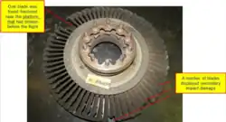 One of the blades inside the turbine had fractured at some point before 7 December flight. During the flight, the fractured blade generated vibration that travelled through the turbine shaft. The vibration enabled physical contact (rub) between components, one of which was the No. 6 seal bearing. Contact between the turbine shaft and the bearing inflicted damage to the bearing, causing some metal flakes from the bearing to get in to the oil system of the engine. The engine finally degraded but it had not failed yet as the turbine was still able to produce power.[6]