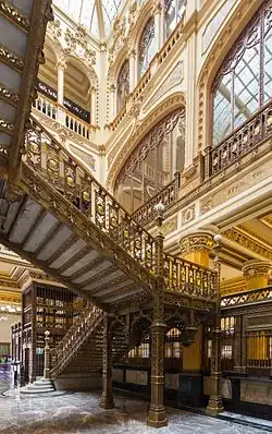 Inside, the marble floors and shelves combine with bronze and iron window frames manufactured in Florence, Italy.[3] The main stairway is characterized by two separate ramps that come together to form a landing. They also seem to cross on the second landing above, after which each move off in their own direction.[5] The meeting room contains frescos by Bartolomé Gallotti painted over a base of 24 carat gold, with themes relating to the history of written communication and the sending of messages.[3]