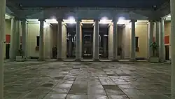 In the interior, the Auditorium and the Library open to a porticoed atrium, with 28 columns of Ionic order on which rests an entablature of granite.