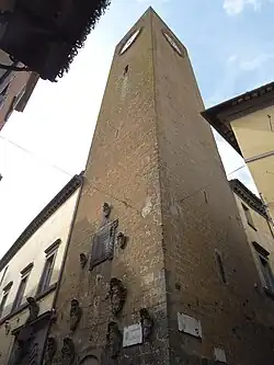 The palace and the adjacent tower were initially built by the Terza family, and later to house the papal household, but in 1319 it was granted to the commune to house the seven consuls, who represented guilds of the town. They were referred as the Signori sette or seven magistrates, who functioned as a local tribunal and council. These magistrates served a term of 2 months, during which they could not have contact with anyone outside the palace. In 1354, when Orvieto came under direct papal rule in 1354, under the local rule of cardinal Albornoz and pope Boniface IX Tomacelli, the palace became a papal residence, including for pope Alexander VI. In 1516 Pope Leo X again transferred the palace to the commune, as a residence for his appointed governor. In the 16th century the palace was refurbished by Ippolito Scalza. In 1831, pope Gregory XVI made the palace the provincial courthouse and jail.[1] The plaque over the entrance recalls Pope Pius V in 1571