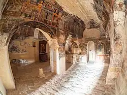Paliachora covers the east, south and west slopes of the peak. The north side was uninhabited, so that the settlement could not be seen from the sea. On top of the peak, at a height of 355 metres, was the castle of Paliachora. The south and west sides of it were naturally defended by the steep slope of the cliff. The entrances to the castle were located on the north and east sides and it communicated with the rest of the settlement through them. Some remains of the walls of the castle are preserved to a height of 1.8 metres. There are also remains of three cisterns and ruins of other structures. The settlement was packed with small houses and churches. It is divided by two main roads, which led up to the castle. Today, very few of the houses are preserved even as foundations, but 38 Byzantine and post-Byzantine churches are preserved, many of which still retain their internal wall paintings.[5]