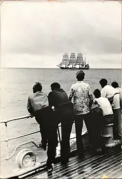 In March 1951, Belgian shipbreakers paid £40,000 for her and Passat.[6] As she was being towed to Antwerp, German shipowner Heinz Schliewen, who had sailed on her in the late 1920s, bought her (and Passat, thus often erroneously referred to as a sister ship).[6] The ships were modernized with refurbished quarters to accommodate merchant marine trainees and fitted with an auxiliary engine, a refrigeration system for the galleys (precluding the need to carry live animals for fresh meat), modern communications equipment and water ballast tanks.[7] Her first trip was to Brazil in 1952 with cement, to return to Germany with iron ore. Early in the outbound voyage the propeller dropped off, "much to the satisfaction of the sail-favoring crew if not the owner."[8] The enterprise went briefly bankrupt but was bought by a new consortium of 40 German shipowners.[9] For the next five years, the ships continued to sail between Europe and the east coast of South America, but not around Cape Horn.[10] They were used as cargo-carrying school ships, primarily to Argentina. Although the German public supported the concept as maritime symbols and sources of national pride, the economic realities of the post-war years placed restraints on the operation. The ships were no longer profitable as freight haulers, and Pamir had increasing technical problems such as leaking decks and serious corrosion. The consortium was unable to get sufficient increased funding from German governments or contributions from shipping companies or public donations, and thus let both vessels deteriorate.[11]