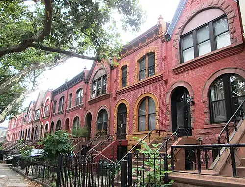 The houses are of three types, arranged in a symmetrical configuration, and feature brick facades with rough-faced brownstone trim. Six of the houses have flat roofs with elaborate cornices, while the others have pitched roofs pierced by triangular and round, Jacobean style gables. Imbuing the row with a picturesque, varying roofline, Kirby united the houses with corbelled brick colonettes decorated with sunflower plaques. The houses feature large round-arch-headed openings that are characteristic of the Romanesque Revival style, as well as richly decorated and textured facades featuring terra-cotta sills decorated with rosettes, corbelled brick sills with sawtooth and beaded moldings and scalloped edges, triangular panels filled with terra-cotta strapwork, and patterned bricks ornamented with projecting knobs that give the row a romantic quality typical of the Queen Anne style.[1]