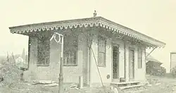 The Medford branch was built by the Boston and Maine Railroad (B&M) in 1847.[3] A station at Park Street was not added until between 1875 and 1889.[4][5] The first station was a wooden structure with a gable roof, located on the north side of the tracks just east of Park Street.[6][7] In the 1890s, the B&M double-tracked the branch to provide more frequent service to compete with electric streetcars.[8] B&M vice president Samuel C. Lawrence became the first mayor of Medford in 1893, partially on promises to provide new station buildings at Park Street and Glenwood.[9]