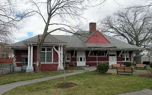 Construction of the new Park Street station began in mid-1893. Because land was difficult to obtain, the B&M originally considered building the station over the tracks.[10] It was designed by Clarence B. Cutler and was completed in 1894. It was unusually large and well-appointed for a branch line station due to the influence of Lawrence; he had his personal gardeners attend to the station grounds.[8][9] The station is a one-story rectangular structure built of red brick with granite base and trim. A hip roof and porte-cochère are supported by posts with large curved brackets.[2][8] The station was located on the south side of the tracks slightly east of the former station; a footbridge was constructed at the station.[9] Reports vary as to whether the original station was demolished, or was moved and reused by the city highway department.[9][7]