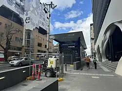 There are four entrances, two serving the University of Melbourne, one outside the Royal Melbourne Hospital, and the other in front of the Peter MacCallum Cancer Centre.[8] An underground walkway connects the entrances and four sets of lifts underneath Royal Parade, while the main station concourse lies beneath Grattan Street.[8] The main entrance features a 50-metre-long steel and glass canopy, and a number of skylights provide natural light to the station concourse, which is clad on one side with green aluminium.[8] Like other Metro Tunnel stations, exposed concrete is a key design element.[8]