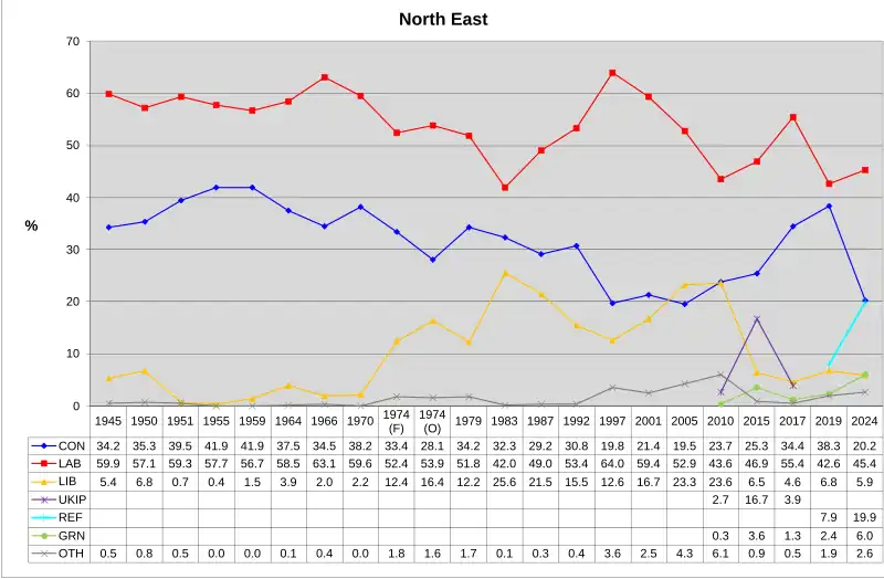 The number of votes cast for each political party who fielded candidates in constituencies comprising the North East region in the 2024 general election were as follows:[6]