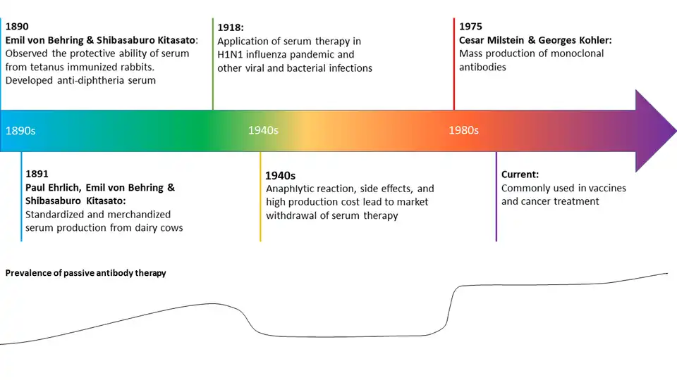 The prevalence of serum therapy surged in the early 19th century. When the H1N1 influenza pandemic (Spanish flu) struck the US and Europe, serum containing antibodies from recovered patients are prevalently injected into patients. With proven therapeutic effects, the applications expanded to other viral and bacterial infections, such as pneumococcus, meningococcus, and rabies, despite an unknown underlying mechanism. Yet, severe anaphylactic reactions and hypersensitivity were common, ergo, serum therapy was pulled out from the market in the 1940s. The resurrection of antibody immunotherapy contributed to Cesar Milstein and Georges J. F. Kohler, who manifested the mass production of pure monoclonal antibodies with limited adverse effects in 1975. Since then, passive antibody therapy has become prevailed as cancer therapeutics and viral treatments.