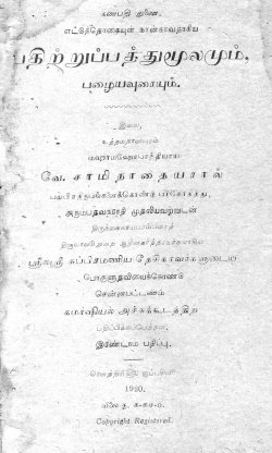 The Patiṟṟuppattu originally contained ten sections of ten poems, each section dedicated to a decade of rule in ancient Kerala (Cerals, Chera); the first and last sections have been lost.[7][8] Of the surviving poems, the second-to-sixth-decade-related poems are about the three generations of rulers from the Imayavaramban dynasty. The remaining poems are about the three generations of rulers from the Irumporai dynasty.[7] In the Patirruppattu's palm-leaf manuscripts, each decade ends with a patikam (a verse epilogue followed by a prose colophon. According to U. V. Swaminatha Iyer (who rediscovered the Sangam manuscripts), a commentary was written in or after the 13th century.[9]