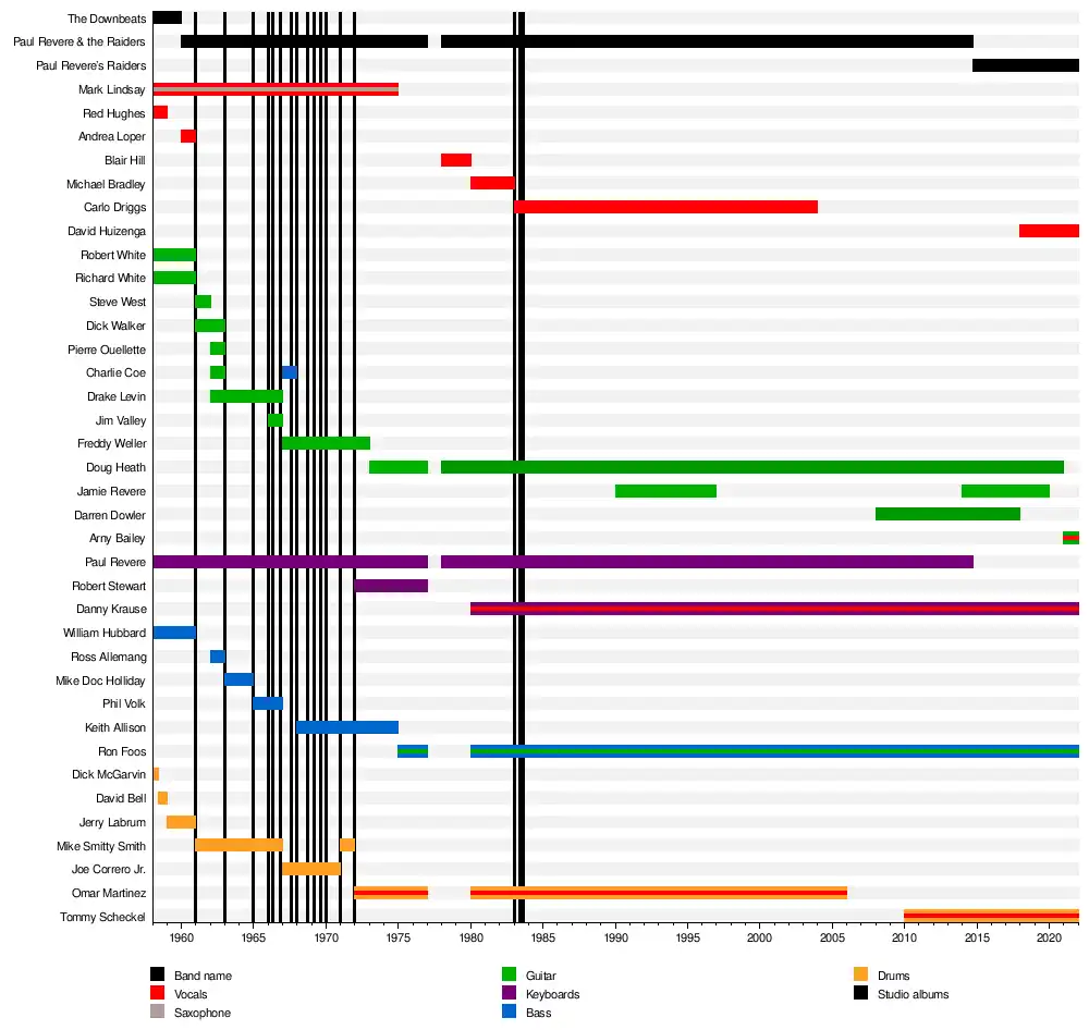 | Past members | Paul Revere Mark Lindsay Robert White Richard White William Hibbard Dick McGarvin Red Hughes Ronnie Robson David Bell Jerry Labrum Andrea Loper Mike "Smitty" Smith Ross Allemang Steve West Dick Walker Charlie Coe Drake "Kid" Levin Mike "Doc" Holladay Phil "Fang" Volk Jim "Harpo" Valley Freddy Weller Joe Correro, Jr. Keith Allison Omar Martinez Robert Wooley Blair Hill Michael Bradley Carlo Driggs Darrin Medley Doug Heath Ron Foos Danny Krause Jamie Revere Darren Dowler Tommy Scheckel David Huizenga Arny Bailey |