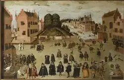 An anonymous Dutch painting, owned by the Hague Historical Museum and currently displayed at the Polish Embassy,[9] De Plaats te Den Haag, gezien naar de Hofvijver (1597) shows a group of figures wearing Polish garments, presumably including Działyński, among other figures notable in the political and religious life of the city at the time.[10][11]