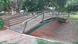 In keeping with the spacious and naturalistic settings that had been created for the animals, only species from the same climatic band as Broome were selected for the Pearl Coast Zoo collection, and for this reason the guidebook explained that animals such as polar bears and Antarctic penguins would not be seen in the park.[7] Boab trees, typical of the Kimberley region, were transplanted to the zoo grounds, having survived "a ten-hour road journey from Derby".[7] To provide protection to the birds from the hot climate, African-style palm-frond thatching was used in the aviaries as roofing material, which was noted as "blending in beautifully with the tropical landscaping of Broome".[34] Overhead sprinklers were also integrated to ensure that birds were kept cool on very hot days. The Palm Cockatoo aviary, at nearly 14 metres high, was specially planned as to allow "full flight travel" for the zoo's rarest (as of 1988) bird, the Great Palm Cockatoo.[34] To create an appropriate environment for the birds, their aviary was landscaped to include a waterfall, pond and a "healthy collection" of Pandanus palms - the kernel of which is a food of the Palm Cockatoo.[34] A corner section of the abandoned palm cockatoo aviary still stood in situ in a corner of unused ground off Koolama Drive as of December 2024.