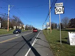 PA 501 begins at an intersection with US 222/PA 272 in the community of Glen Moore in Manheim Township, Lancaster County, north of the city of Lancaster. From here, the route heads north on Lititz Pike, a five-lane road with a center left-turn lane, with the southbound direction running concurrent with southbound US 222. The road passes through business areas and runs to the east of a residential neighborhood before reaching an interchange with the US 30 freeway, where the road is a four-lane divided highway. At this point, the concurrency with southbound US 222 ends and PA 501 continues north as a three-lane road with a center left-turn lane. The route heads through suburban residential areas with some businesses, passing through Overlook and Brooklawn. Farther north, the road narrows to two lanes. In the community of Neffsville, PA 501 intersects PA 722, with that route turning north for a concurrency before it splits to the east on East Oregon Road. Past this, PA 501 passes near more suburban residential and commercial development, gaining a center left-turn lane again. The road becomes two lanes again and runs between farm fields to the west and the Lancaster Airport to the east before it crosses into Warwick Township.[2][3]
