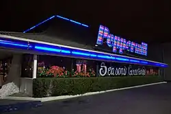 The interior originally featured orange and brown colors, and wagon-wheel lamps above the tables. The color scheme would later become maroon and mauve,[6] before settling on the current design.[30] The restaurant's artificial cherry blossoms, added in the 1990s, came from the former Peppermill resort in Mesquite, Nevada.[6] Kitchen upgrades and new carpeting, with the same design, were added in 2014.[31] A new roadside sign was also added four years later, but the property's design has otherwise remained the same.[32] The restaurant's rooftop sign was destroyed in a 2023 windstorm, and was replaced by an LED version as part of a year-long renovation and maintenance project, which mostly retained the interior design.[33]
