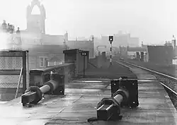 The station's platform around 1968. In view to the west are St Leonard's-in-the-Fields Church (left) and the now-demolished Dewar's whisky facility (centre).