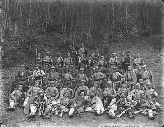 Petar Angelov participated in the Balkan Wars in the revolutionary band of Yane Sandanski, and later in the third company of the fifth Odrin Battalion of the Macedonian-Adrianopolitan Volunteer Corps in the Bulgarian Army.[2] In 1913, he was promoted to the rank of an officer for his courage. He also participated in the First World War, after which he retired.