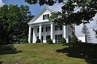 It is a 2+12-story wood-frame structure, with a gabled roof, clapboard siding, and granite foundation. The east-facing gable front is fully pedimented, extending beyond the main block to form a Greek temple portico with four two-story paneled square columns. There are paneled pilasters at the corners of this facade, which is three bays wide, with elongated sash windows flanking the entrance on the ground floor, and smaller sashes above. A small sash window fills the gable of the portico.[2]