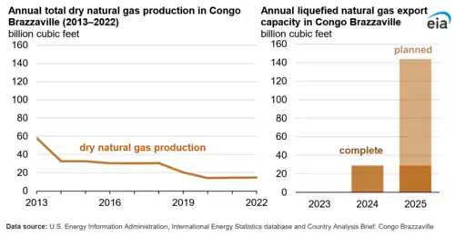 Congo holds the fifth-largest proved reserves of natural gas in Sub-Saharan Africa, at 3.2 Tcf, A majority of natural gas around 65% is reinjected and 21% flared.[9]
