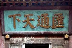 The Beijing branch of the Rishengchang had a large plate (竖匾) above its main entrance with the text Huitong Tianxia (匯通天下, 'Financial exchange all over the world'), for many years.[5]