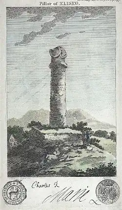 The Pillar of Eliseg – also known as Elise's Pillar or Croes Elisedd in Welsh – stands near Valle Crucis Abbey, Denbighshire, Wales [Grid reference SJ 20267 44527]. It was erected by Cyngen ap Cadell (died 855), king of Powys in honour of his great-grandfather Elisedd ap Gwylog. The form Eliseg found on the pillar is assumed to be a mistake by the carver of the inscription.
