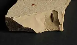 Plattenkalk is a very finely grained limestone chemically precipitated in a stratified water column under conditions where bioturbation does not occur. The reasons for the quiet depositional environment and the processes of sediment accumulation vary greatly among different plattenkalks, but the lack of bioturbation contributes to the creation of thinly bedded, finely laminated, undisturbed limestones where exceptionally detailed fossils or imprints of organisms occur. The Solnhofen Plattenkalk in Bavaria is a famous example where complete skeletons of large marine vertebrates and impressions of soft-bodied animals have been found.[1][2][3] Lithographic limestone is a type of plattenkalk chosen for its suitable lithography characteristics.