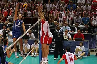 Left-wing attack from Winiarski at FIVB World League 2014 against Iran.