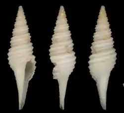 Original description: "Shell small for genus, slender, elongated; whorls rounded, without shoulder; body whorl with 5 large, sharp-edged cords; spire whorls with 3 cords; siphonal canal with numerous fine spiral threads; anal notch narrow, deep; shell color pure white, interior of aperture white; periostracum thick, velvety."[2]