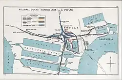 South of the station the line and the Poplar High Street bridge the line split with the easterly line diverging and rising up and over by means of a bridge the London and Blackwall Railway (LBR) route to the North London basin and sidings in the docks area. The LBR had refused an at-grade crossing on their already busy line but there was a further junction off this line (known as Poplar Junction) that was used to allow through running to Blackwall in 1870.[3] The other route from Poplar went to Harrow Lane sidings where traffic could be routed to other docks on the Isle of Dogs.