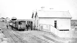 The wooden station building was opened in 1876 at the terminus of the lightly engineered, 1067 mm (3 ft 6 in) gauge railway from Port Pirie – then a town of fewer than 1,000 people – into the rich agricultural hinterland of the Mid North. The need was to transport agricultural produce more cheaply to the port for export, mainly to Great Britain, in sailing ships.[1]: 27  The following year, Port Pirie's inaugural railway station was opened. A modest weatherboard building, it was placed at the north end of the railway yards, about 250 metres (270 yards) from the town's wharves.[2] In addition to the building there were two locomotive sheds and a freight shed, coaling and watering facilities, a passing loop in front of the station building, and a few sidings.