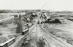 Since the railway was such an advance over horse-drawn wagons or bullock drays over unmade roads, traffic soon increased significantly, especially when in the following year the line reached the nearest town in the hinterland – Gladstone, 52 km (32 mi) east of the port – and, more so, Petersburg,[note 2] a further 64 km (40 mi) east, in 1881.[3][4] In the years that followed, more trackage was constructed in the yards to accommodate the increased tonnages and variety of freight. The yards eventually became known as "Port Pirie South Yard", then many years later, "Pirie Main Yard".[1]: 27  [note 3]