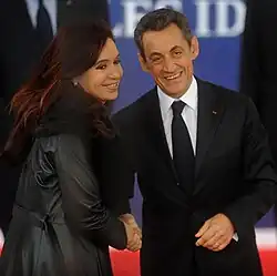 In September 2010, it was announced that Argentina was elected president of the Group of 77+China and prepared to act as a ‘bridge" with G-20 major economies to which it also belongs.[82] She visited Chile during their Bicentenary celebrations where she also assisted at the baptism of a Chilean baby, Anaís Escobar Maldonado, born in the Argentine Hospital deployed at Curico after the earthquake. The visit had a high profile in the media mainly because of the possible extradition to Chile of Sergio Apablaza. She met with president Sebastián Piñera and participated in the festivities at the national stadium.[83] She also confirmed the celebration of the III bi-national cabinet meeting for next October.[84][85] Fernández de Kirchner then departed for New York to give her United Nations General Assembly speech where she once again criticized Britain over the Falklands (Malvinas) issue, and Iran for the 1994 AMIA bombing whilst giving her support for an Israeli-Palestinian dialogue and an eventual Palestinian state.[86] On 30 September she hosted the UNASUR presidents' emergency summit at Buenos Aires due to the Ecuador crisis and started an official visit to Germany the following day in order to participate as a Guest of Honour at the Frankfurt Book Fair[87] and meet with Chancellor Angela Merkel. In October she inaugurates the III News Agencies World Congress to be held in Bariloche.[88] This same month, and as part of the 2006 civilian nuclear-power reactivation program, Fernández reopened the Pilcaniyeu uranium enrichment plant, put on ice in the 1990s, amid worsening shortages of natural gas.[89] Following the death of her spouse (see below), she also resumed activities and flew to South Korea for the G20 Seoul summit. After her return she announces that the Paris Club agrees to debt talks without the International Monetary Fund intervention as proposed by Argentina since 2008. These negotiations will result in the settlement of the last portion of the sovereign debt defaulted in the 2001 crisis after the successful restructuring debts of 2005 and 2009.[90] In November she also participated in the UNASUR Summit at Guyana after which will host the XX Ibero-American Summit at Mar del Plata.