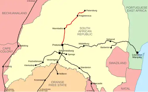 The railway network of the South African Republic in 1899 (at the start of the Second Anglo-Boer War) with the Pretoria-Pietersburg railway line in red.